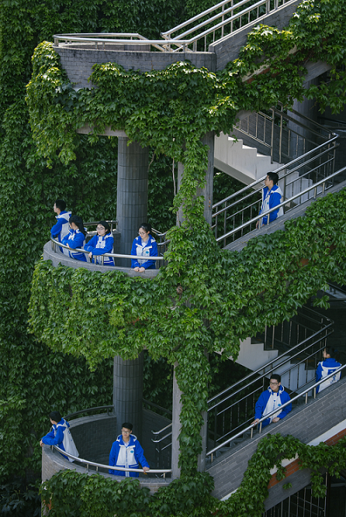 校园里的爬山虎叶在阳光底下一动一动的放着一层绿光,荡漾着金色阳光的大气,展现着整个校园的灵气。错竹、蔷薇、三角梅、高杨树流连忘返于这充满诗意的学堂里,似乎听见青春的呼唤生命的轨迹绵延不绝。